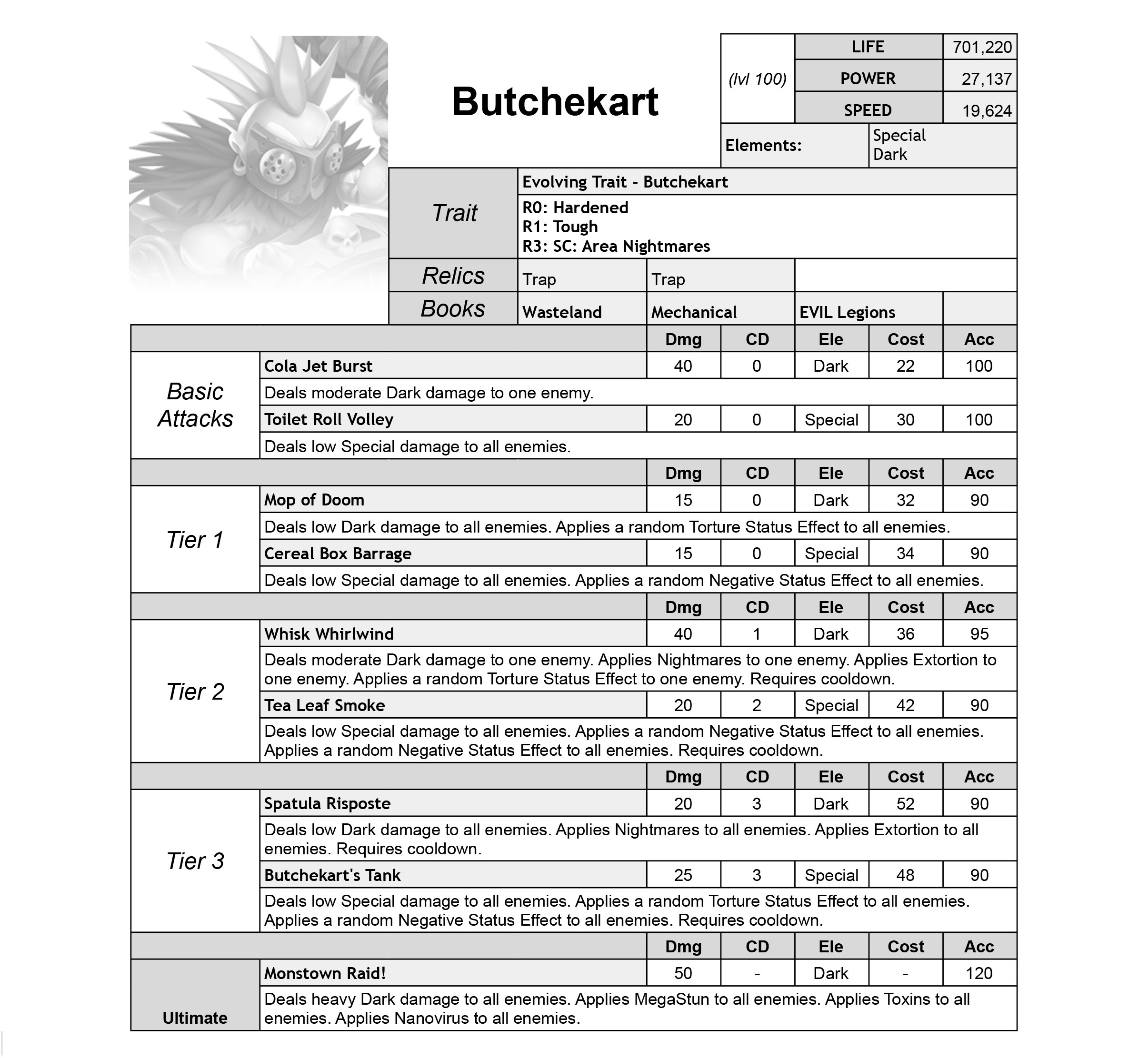 Butchekart is a Special and Dark Support mobster with Tortures, Extortion, and random negative effects.