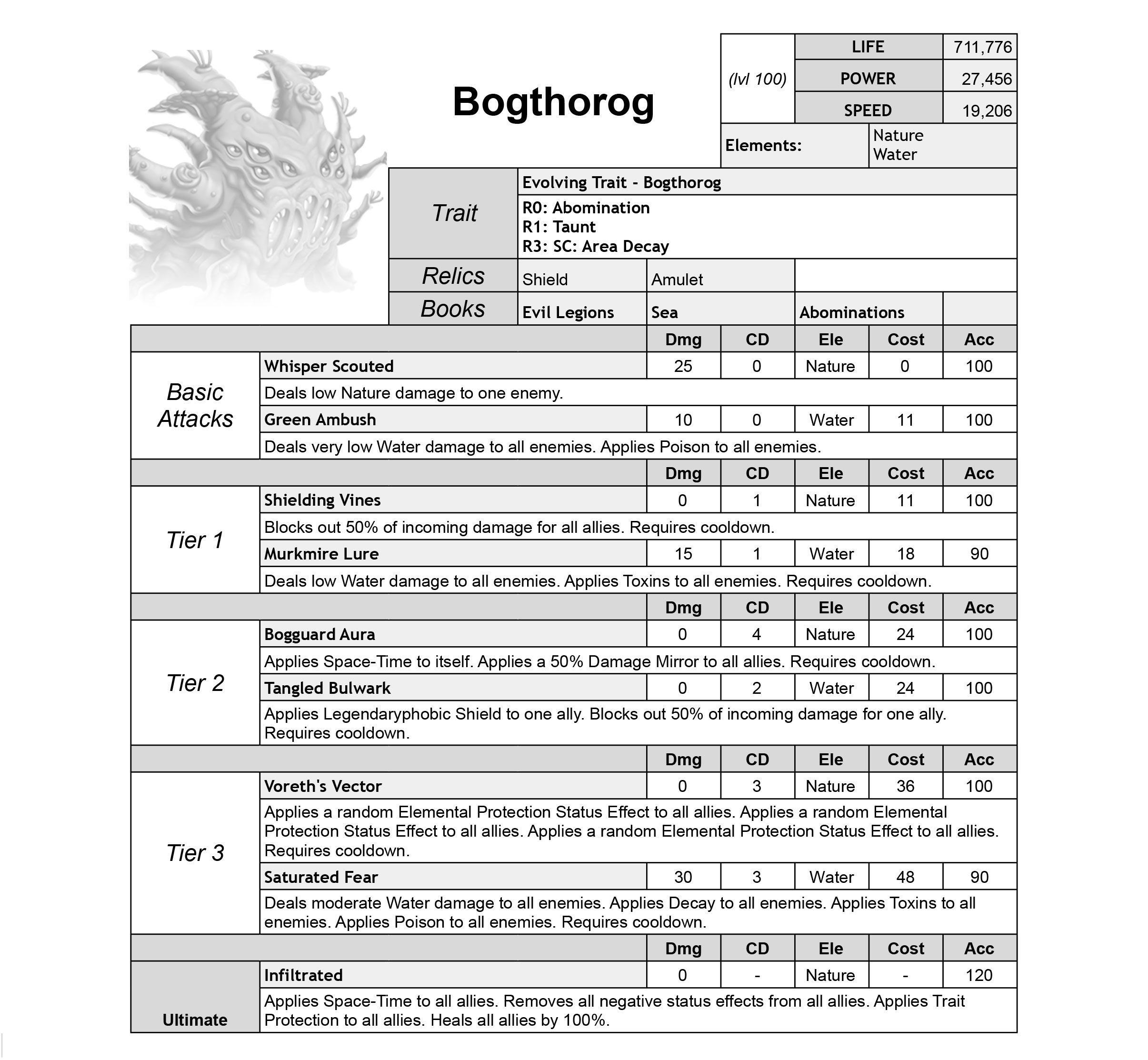 Bogthorog is a Taunt Tank with Space-Time, Damage Protection, and Elemental Protection, with a side of Torture skills.