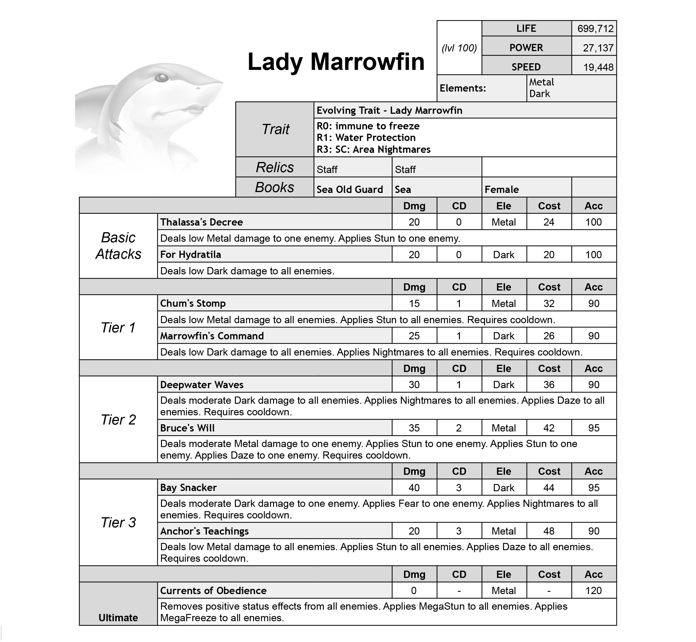 Lady Marrowfin is a Metal and Dark Controller with Stun and Fear skills.