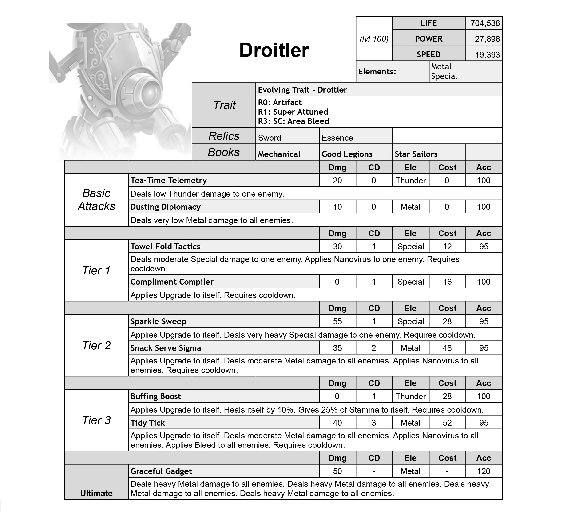 Droitler is an Artifact Attacker with Bleed, Nanovirus, and multiple Upgrade skills.