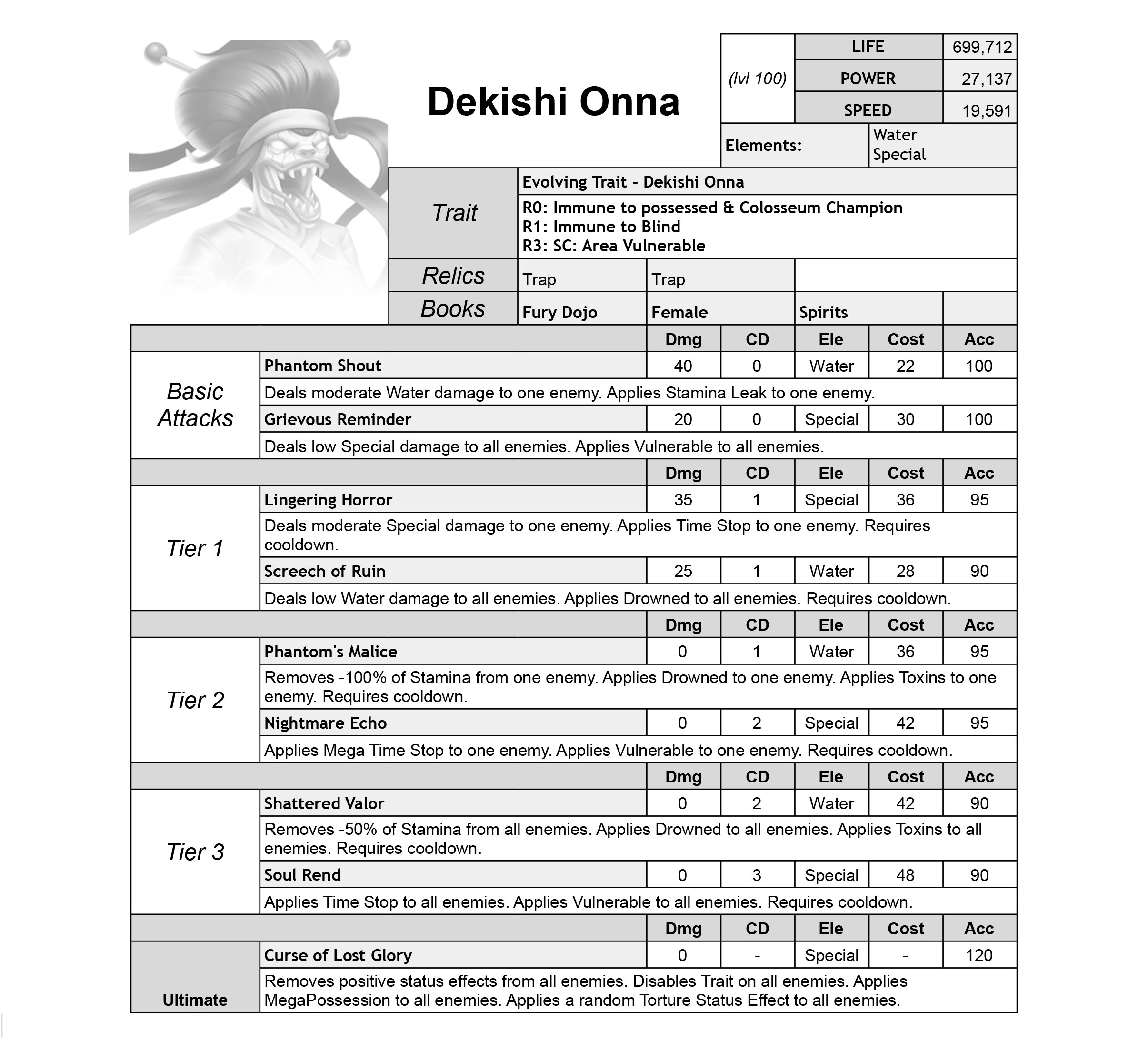 Dekishi Onna is a Water and Special Controller with Time Stop, Vulnerable, and Toxins skills.