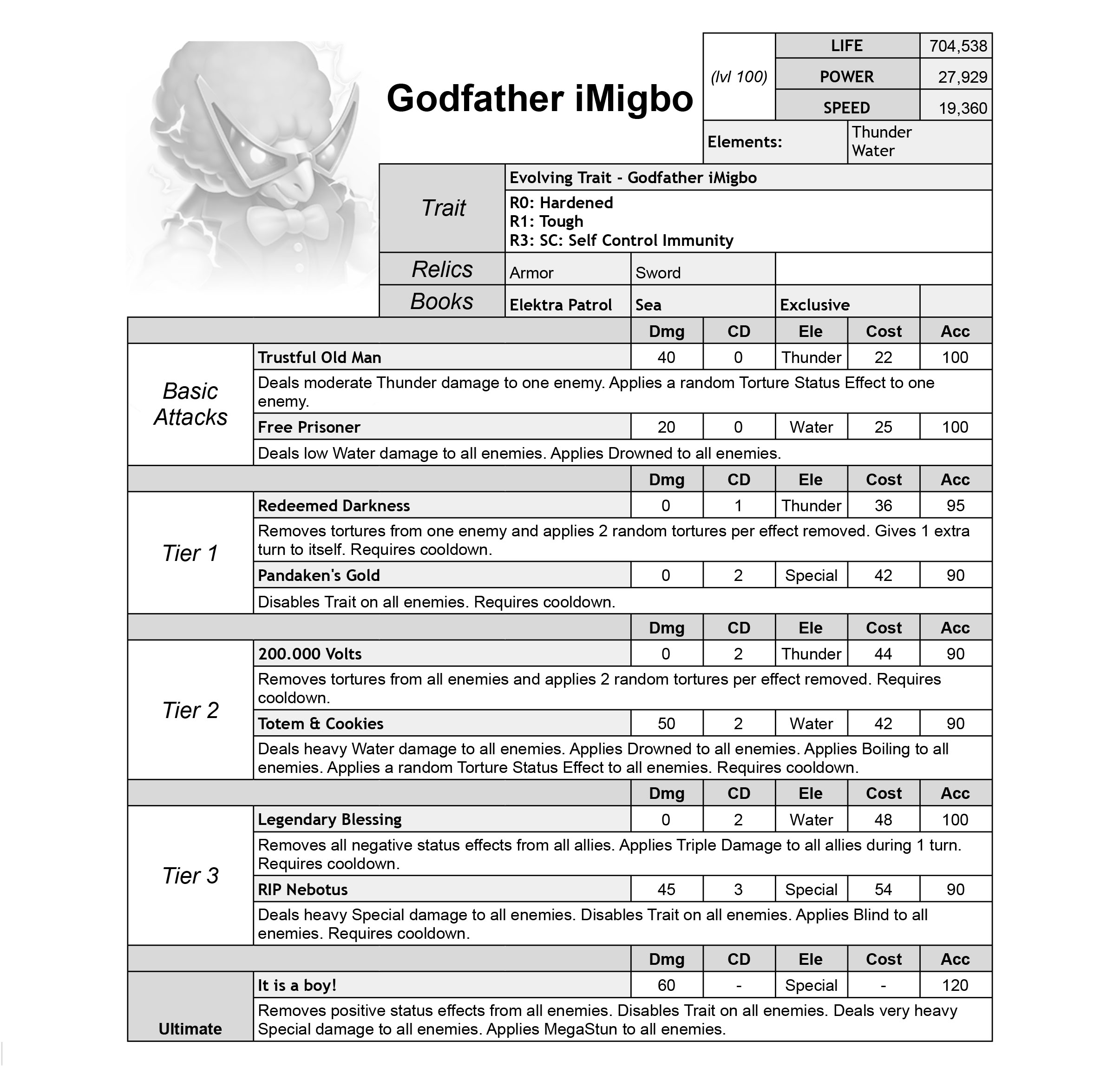 Godfather iMigbo is a Thunder and Water Attacker with Trait Disable and multiple Torture skills.