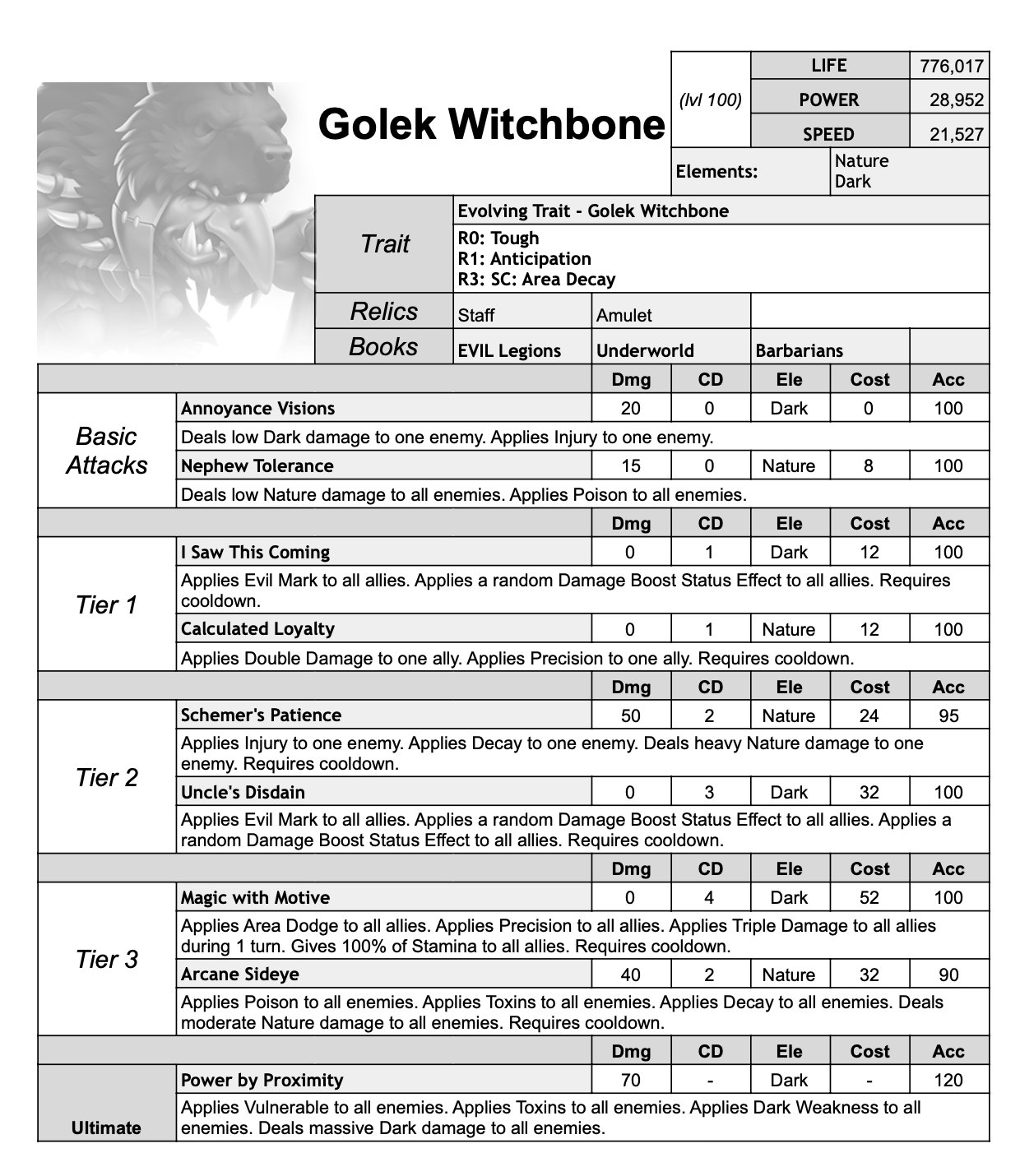 Golek Witchbone is Zneaky Widezmirk's uncle. He doesn't exactly like his nephew, though. In fact, he can't stand how annoying he is, but here's the thing: In one of his magic rituals, Golek had a vision in which he saw that Zneaky would accidentally become the next leader of the Barbarians, so he rallied to his nephew's side, not to support him, but because he desperately wants Weirdika's job as the main magician in the faction.\n