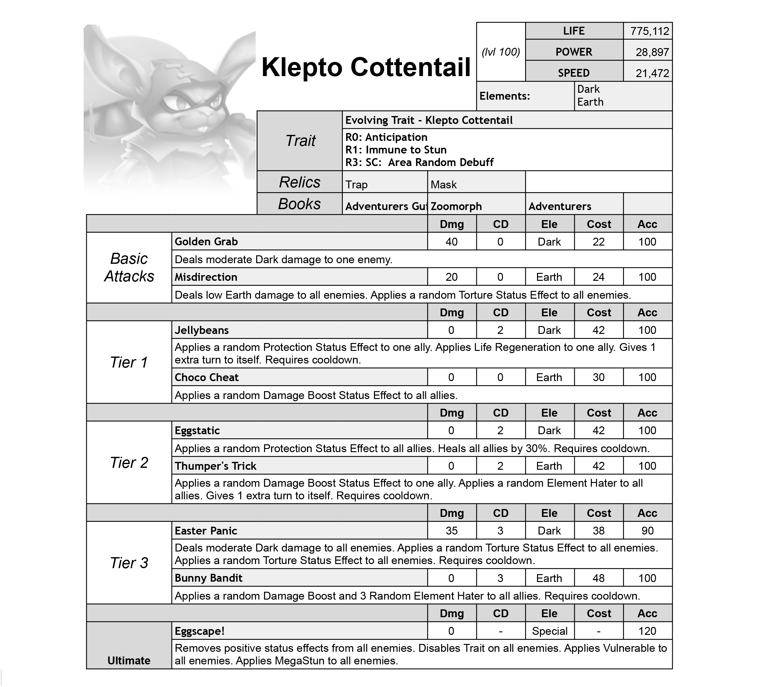 Klepto Cottentail is a Dark and Earth Support with Anticipation trait and random Damage Boost skills.