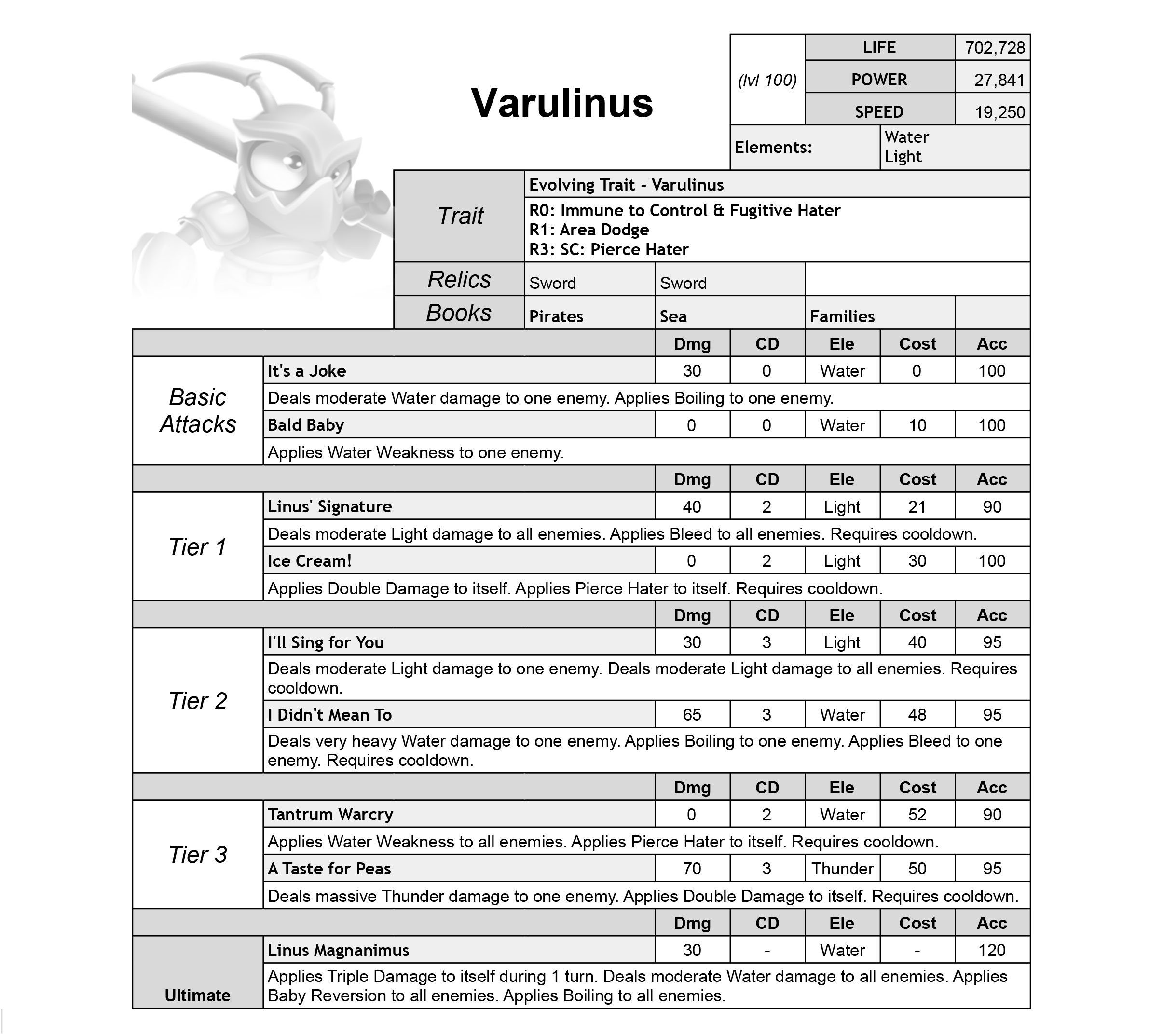 Varulinus is a Water Light Attacker with Pierce Hater, Water Weakness, Boiling, Bleed, and Double damage skills.