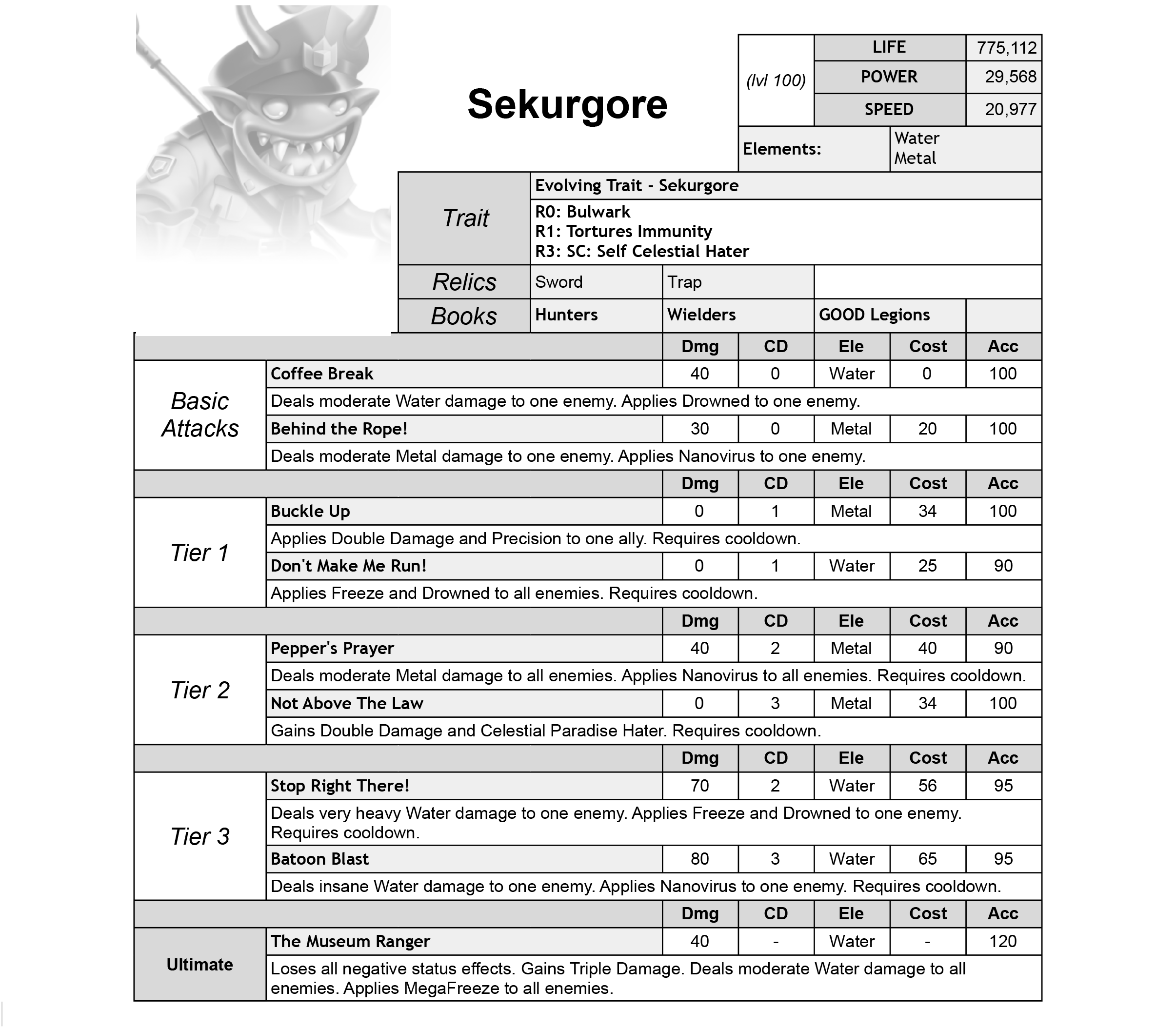 Sekurgore is a Water Metal Attacker with Celestial Hater, Double Damage, Freeze, Nanovirus, and Drowned skills.