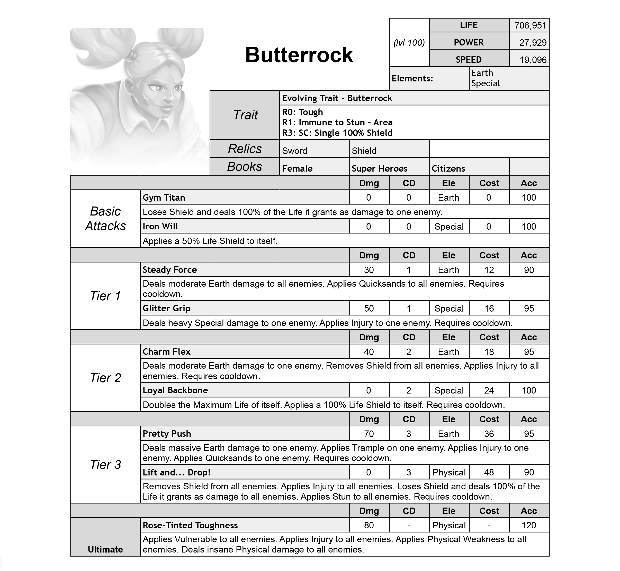 Butterrock is a Brute Attacker with Trample, Shield Slam, Shield Break, Double Life, Shields, and Quicksands skills.