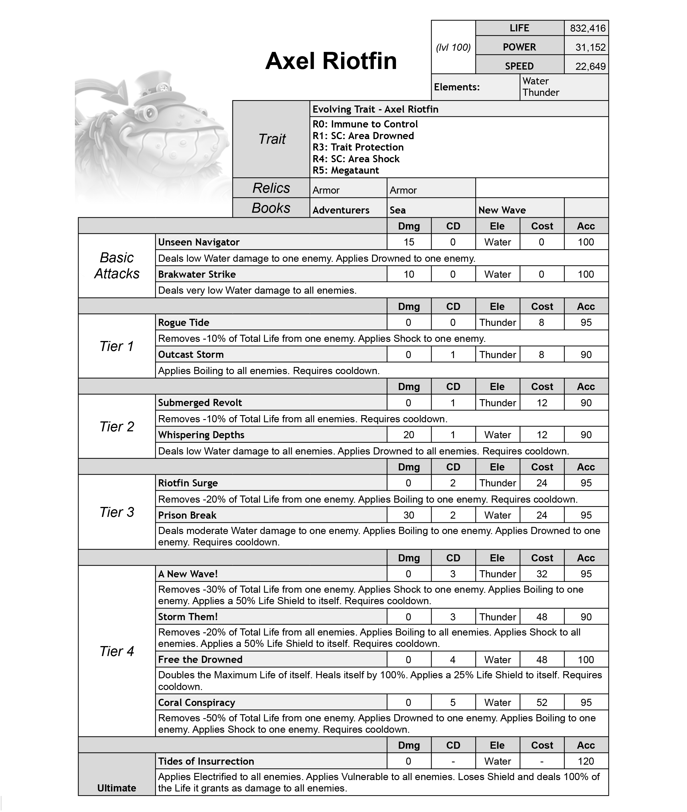 Axel Riotfin is a Tank - Brute hybrid with Life Removal, Drowned, Shock, and Boiling skills, plus Trait Protection and Tough as traits.
