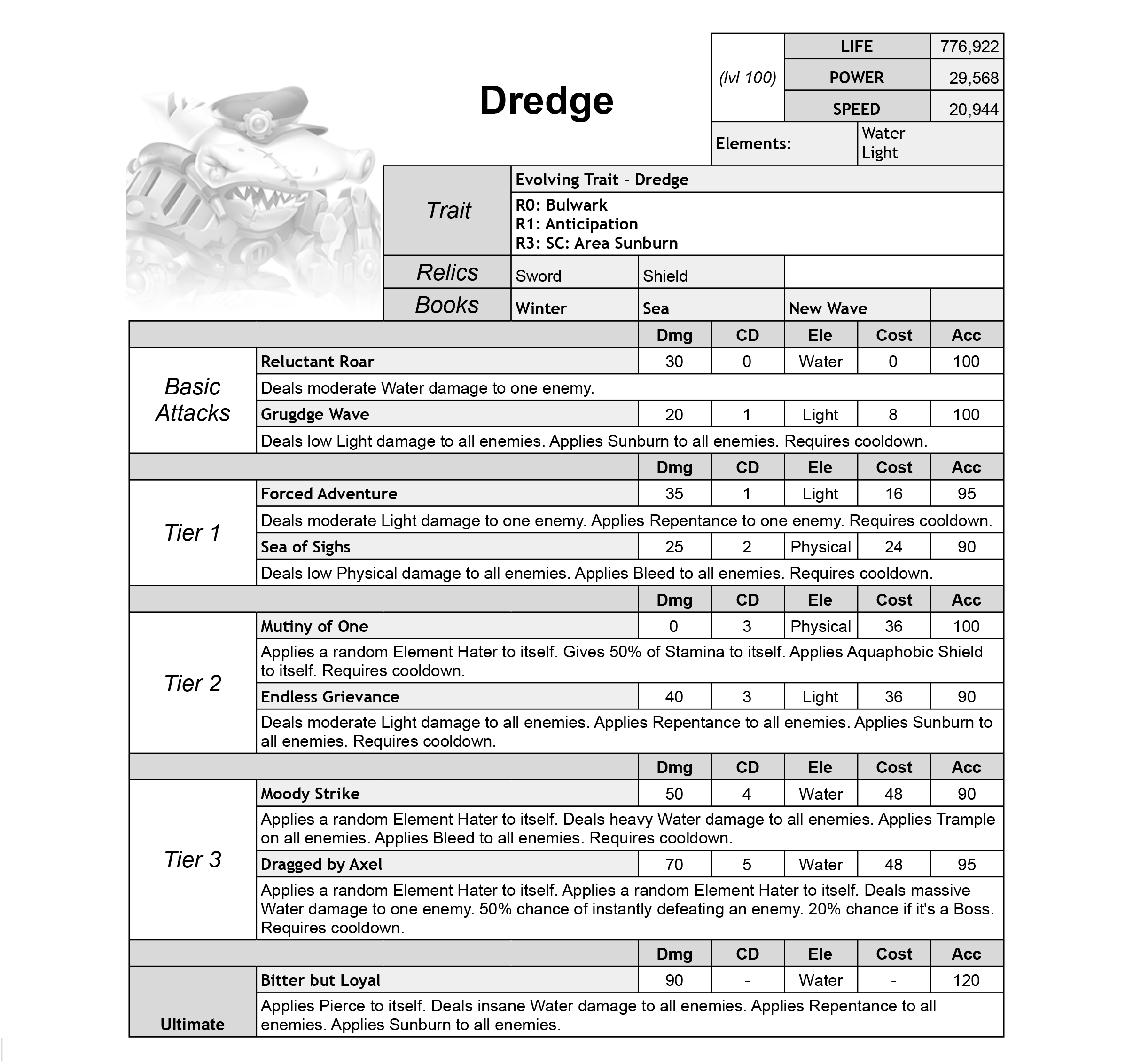 Dredge is a Brute Attacker with Instant Defeat, Repentance, Sunburn, Bleed, and random Hater skills, plus Bulwark and Aquaphobic Shield as traits.