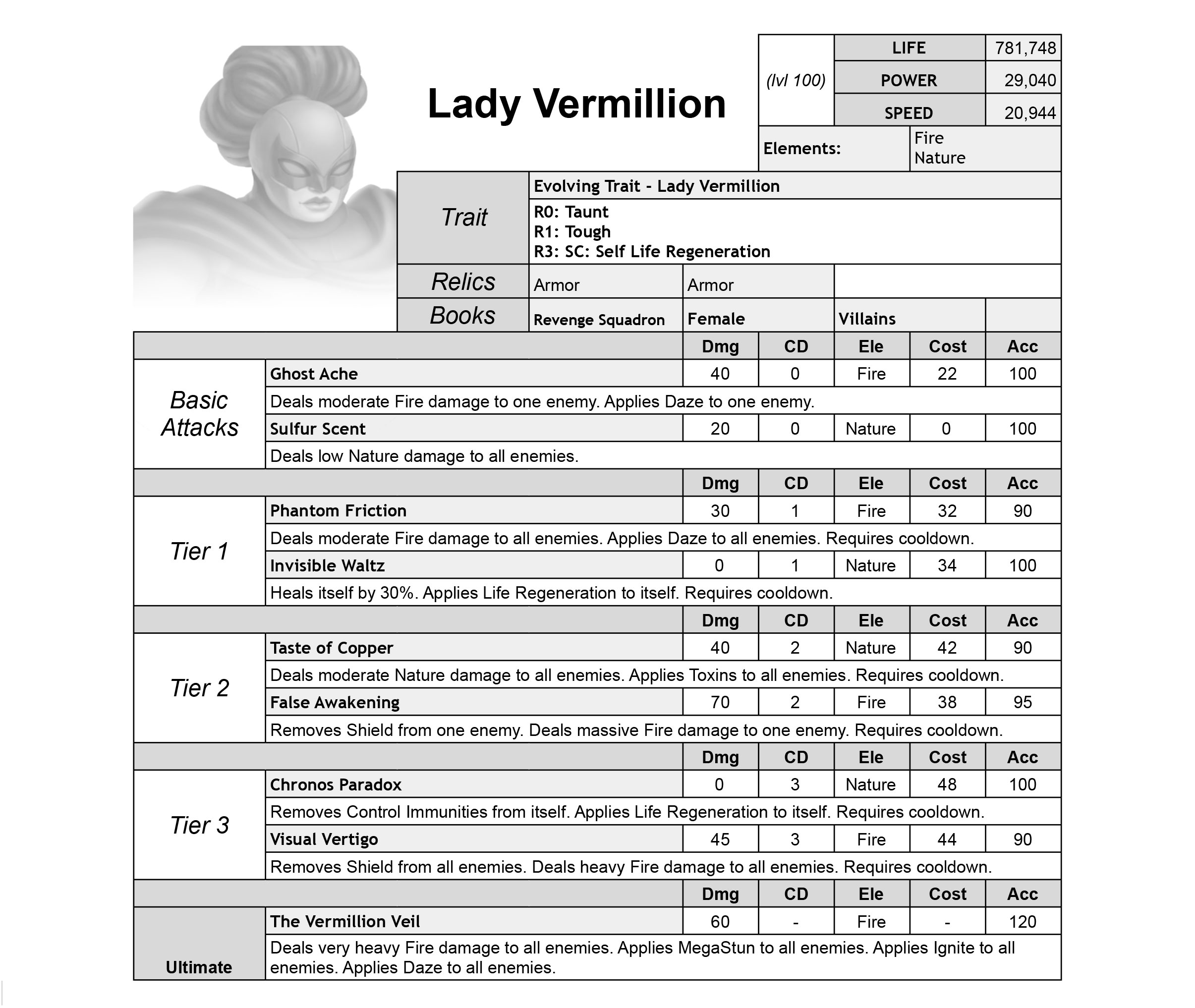 Lady Vermillion is a Fire and Nature Tank with Taunt as a trait and Control Immunity skills.