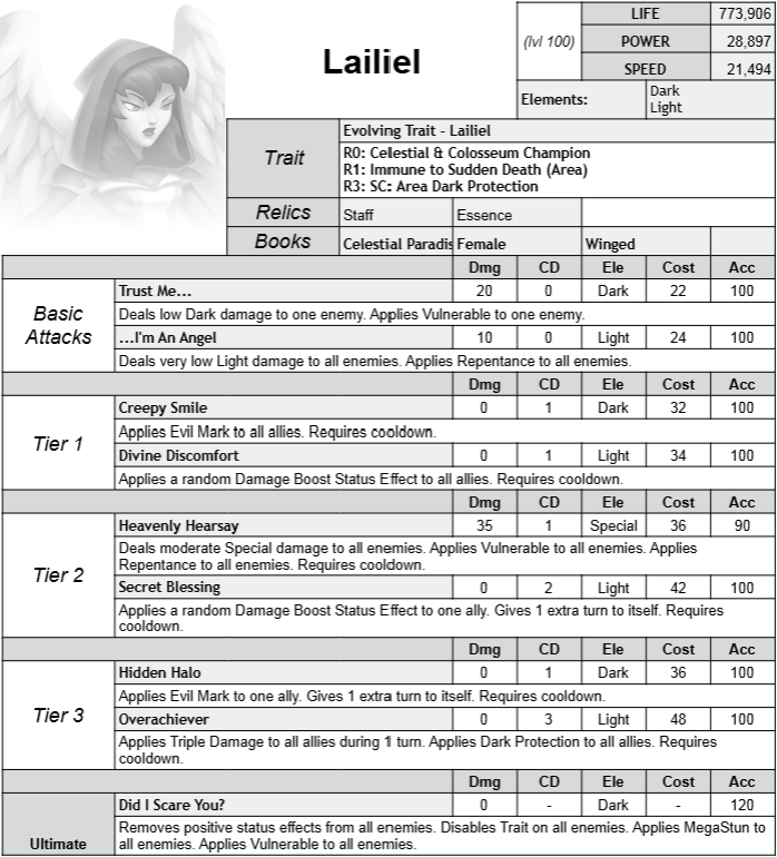 Lailiel is a Dark and Light Support monster with Dark Protection, Evil Marks, and random Damage Boosts skills.