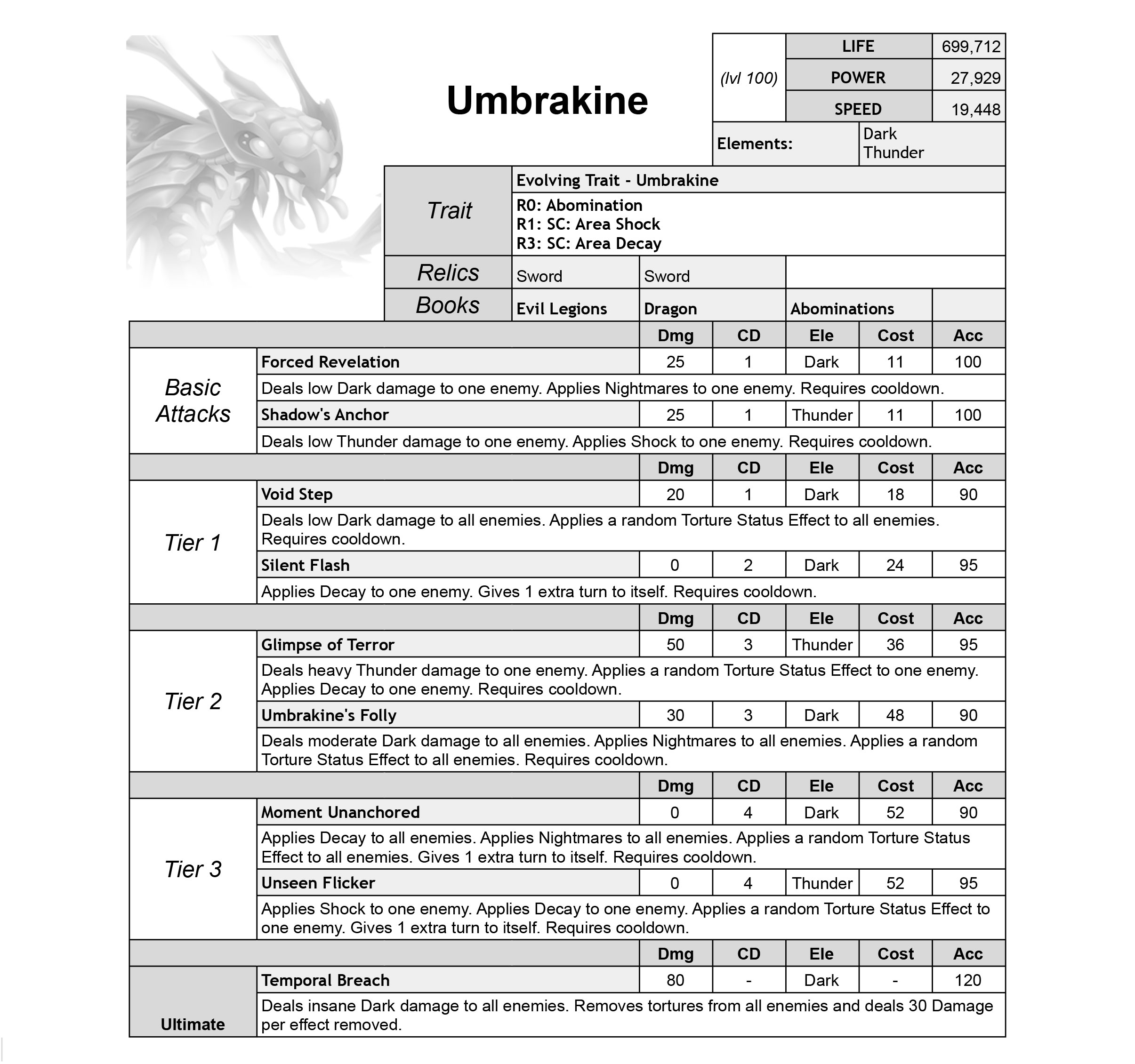 Umbrakine is an Extra Turn Attacker with Shock, Nightmares, random Tortures and Decay skills.